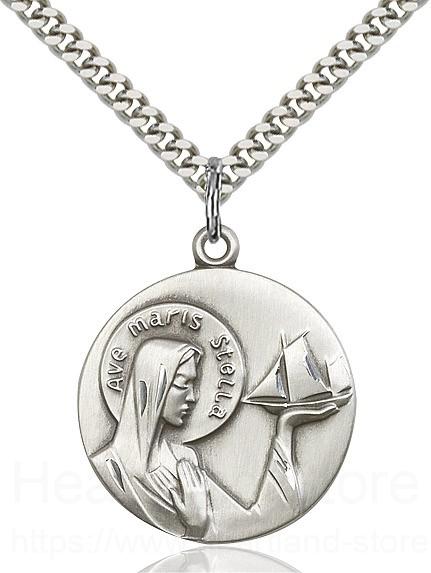 About this Our Lady Star of the Sea Medal, Sterling Silver + 24" 2.2mm Sterling Silver Chain + Clasp