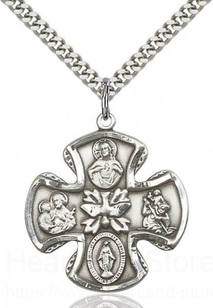 This 5 Way Cross Pendant features the Sacred Heart, St. Joseph, St. Christopher, the Miraculous Symbol, and the Holy Spirit.