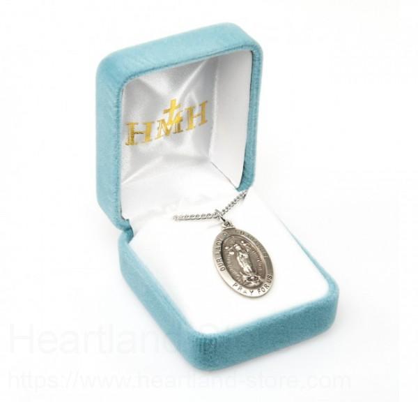 Can be worn by a man or woman, this oval Our Lady of Guadalupe necklace has a high relief raised border which hold the text OUR LADY OF GUADALUPE PRAY FOR US. In the center is a traditional image of Our Blessed Mother surrounded by angels as she appeared before Juan Diego.