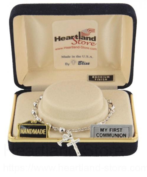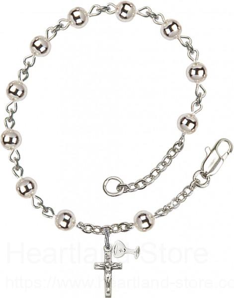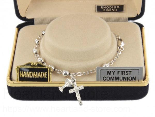 Simple, elegant and stunning! This handmade silver plated pewter First Communion charm bracelet has high-polish 5mm round beads. A truly meaningful gift that will surely delight with two featured charms: a Crucifix, and the First Communion chalice.