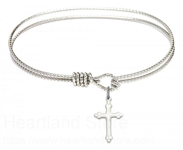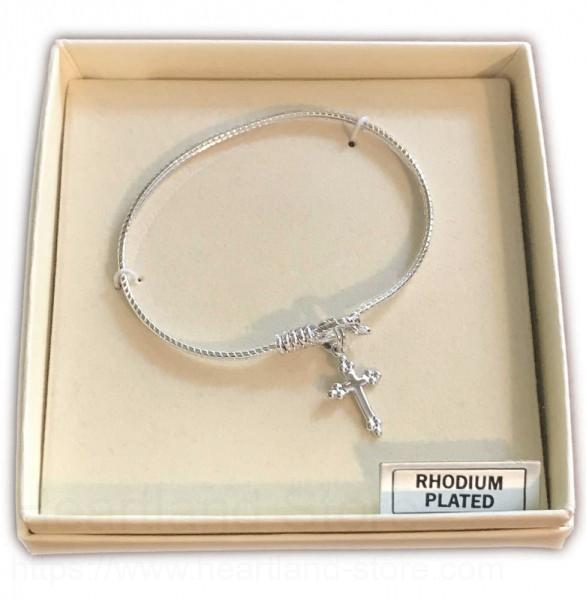 ✞ Handmade rhodium plated pewter charm bangle bracelet ✓ Bracelet is designed with a double tier cable twist wire with oval eye hook closure ✓ Attached charms: a Small Budded Tip Cross ✓ Flash rhodium finish to give the jewelry extra value and shine ✓