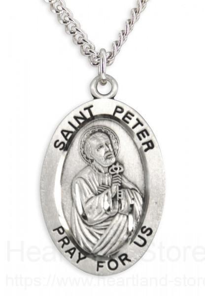An oval shaped necklace with a medal of Saint Peter in the center. St. Peter is know as the first pope of the Church and was named by Jesus the "Rock of My Church".