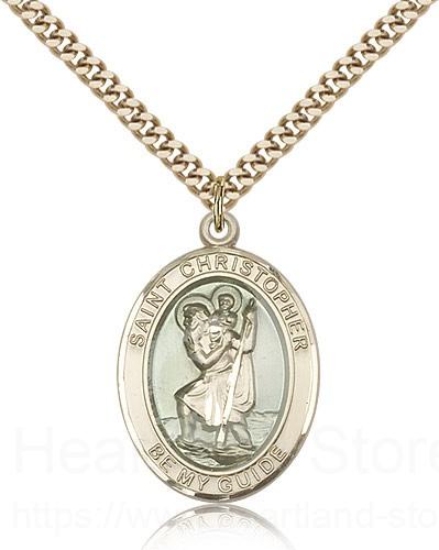 St. Christopher Medal This St. Christopher Pendant is made of gold filled and is approximately the size of a quarter. The jewelry pendant is paired with a 24 inch gold filled heavy curb chain as pictured. All medals are gift boxed in a beautiful blue velvet hinged jewelry gift box.