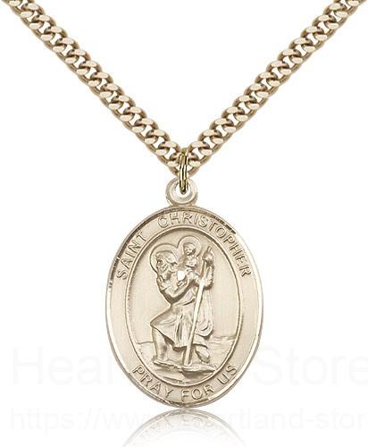 St. Christopher Medal This St. Christopher Pendant is made of gold filled and is approximately the size of a quarter. The jewelry pendant is paired with a 24 inch gold filled heavy curb chain as pictured. All medals are gift boxed in a beautiful blue velvet hinged jewelry gift box.