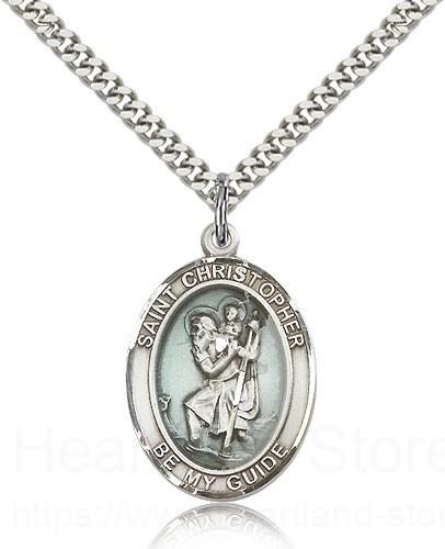 About this St. Christopher Medal with Blue Enamel, Sterling Silver, Large + 24" 2.4mm Rhodium Plate Chain + Clasp