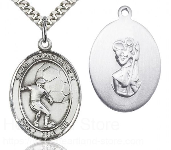 About this St. Christopher Soccer Medal, Sterling Silver, Large + 24" 2.4mm Rhodium Plate Chain + Clasp
