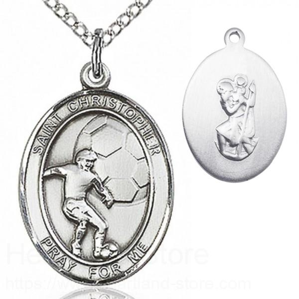 St. Christopher Soccer Medal This St. Christopher Soccer Pendant is made of sterling silver and is approximately the size of a dime. The jewelry pendant is paired with a choice of chain options. All medals are gift boxed in a beautiful blue velvet hinged jewelry gift box.