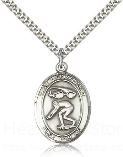 This St. Christopher Swimming Pendant is made of sterling silver and is approximately the size of a quarter. The jewelry pendant is paired with a 24 inch stainless steel heavy curb chain as pictured. All medals are gift boxed in a beautiful blue velvet hinged jewelry gift box.