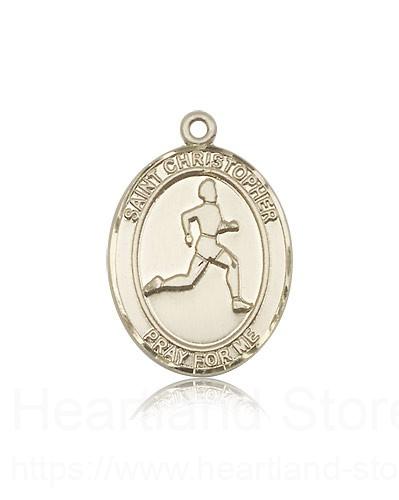 St. Christopher Track and Field Medal This St. Christopher Track and Field Pendant is made of 14 Karat Gold and is approximately the size of a quarter. The jewelry pendant is sold individually and does not come with a chain. All medals are gift boxed in a beautiful blue velvet hinged jewelry gift box.