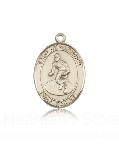 This St. Christopher Wrestling Pendant is made of 14 Karat Gold and is approximately the size of a quarter. The jewelry pendant is sold individually and does not come with a chain. All medals are gift boxed in a beautiful blue velvet hinged jewelry gift box.