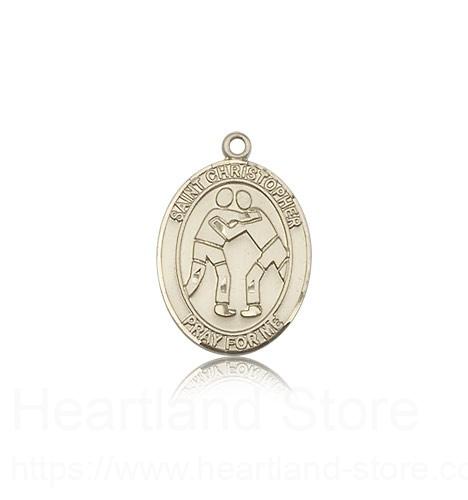St. Christopher Wrestling Medal This St. Christopher Wrestling Pendant is made of 14 Karat Gold and is approximately the size of a nickel. The jewelry pendant is sold individually and does not come with a chain. All medals are gift boxed in a beautiful blue velvet hinged jewelry gift box.