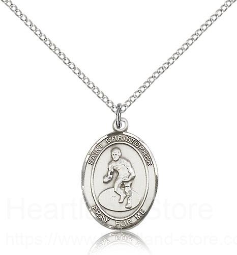 This St. Christopher Wrestling Pendant is made of sterling silver and is approximately the size of a nickel. The jewelry pendant is paired with an 18 inch sterling silver light curb chain as pictured. All medals are gift boxed in a beautiful blue velvet hinged jewelry gift box.