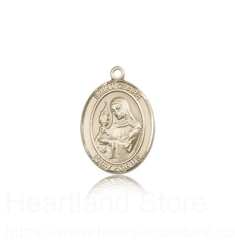St. Clare of Assisi Medal This St. Clare of Assisi Pendant is made of 14 Karat Gold and is approximately the size of a nickel. The jewelry pendant is sold individually and does not come with a chain. All medals are gift boxed in a beautiful blue velvet hinged jewelry gift box.