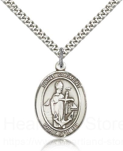 St. Clement Medal This St. Clement Pendant is made of sterling silver and is approximately the size of a quarter. The jewelry pendant is paired with a 24 inch stainless steel heavy curb chain as pictured. All medals are gift boxed in a beautiful blue velvet hinged jewelry gift box.
