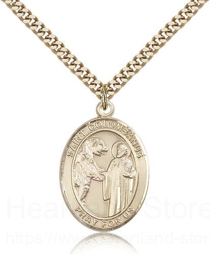 St. Columbanus Medal This St. Columbanus Pendant is made of gold filled and is approximately the size of a quarter. The jewelry pendant is paired with a 24 inch gold filled heavy curb chain as pictured. All medals are gift boxed in a beautiful blue velvet hinged jewelry gift box.