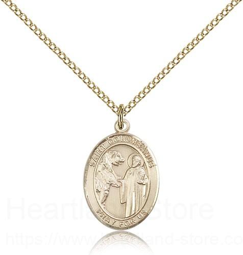 St. Columbanus Medal This St. Columbanus Pendant is made of gold filled and is approximately the size of a nickel. The jewelry pendant is paired with an 18 inch gold filled light curb chain as pictured. All medals are gift boxed in a beautiful blue velvet hinged jewelry gift box.