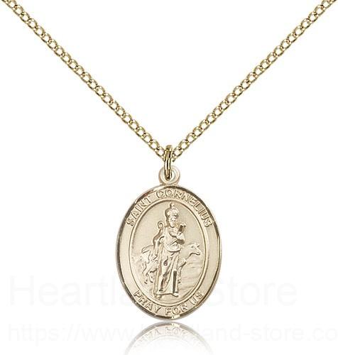 St. Cornelius Medal This St. Cornelius Pendant is made of gold filled and is approximately the size of a nickel. The jewelry pendant is paired with an 18 inch gold filled light curb chain as pictured. All medals are gift boxed in a beautiful blue velvet hinged jewelry gift box.