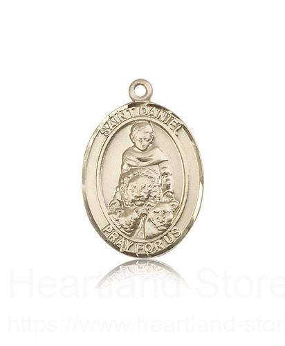 This St. Daniel Pendant is made of 14 Karat Gold and is approximately the size of a quarter. The jewelry pendant is sold individually and does not come with a chain. All medals are gift boxed in a beautiful blue velvet hinged jewelry gift box.