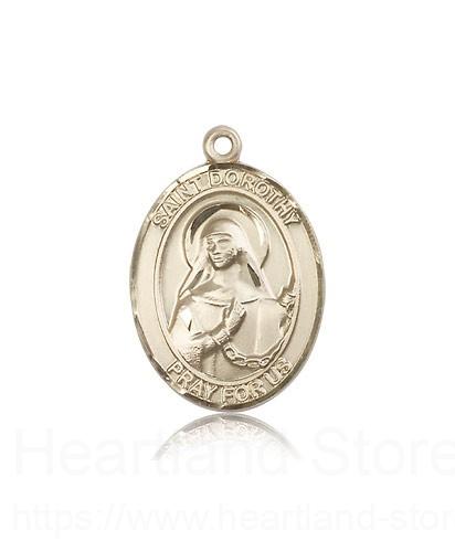 This St. Dorothy Pendant is made of 14 Karat Gold and is approximately the size of a quarter. The jewelry pendant is sold individually and does not come with a chain. All medals are gift boxed in a beautiful blue velvet hinged jewelry gift box.