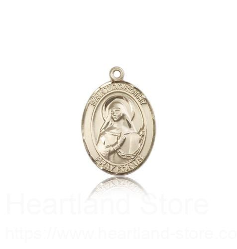 This St. Dorothy Pendant is made of 14 Karat Gold and is approximately the size of a nickel. The jewelry pendant is sold individually and does not come with a chain. All medals are gift boxed in a beautiful blue velvet hinged jewelry gift box.