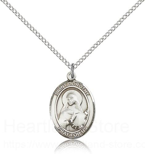 This St. Dorothy Pendant is made of sterling silver and is approximately the size of a nickel. The jewelry pendant is paired with an 18 inch sterling silver light curb chain as pictured. All medals are gift boxed in a beautiful blue velvet hinged jewelry gift box.