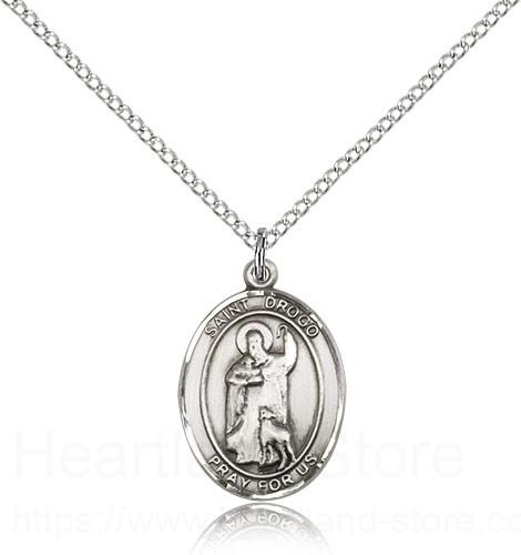 St. Drogo Medal This St. Drogo Pendant is made of sterling silver and is approximately the size of a nickel. The jewelry pendant is paired with an 18 inch sterling silver light curb chain as pictured. All medals are gift boxed in a beautiful blue velvet hinged jewelry gift box.