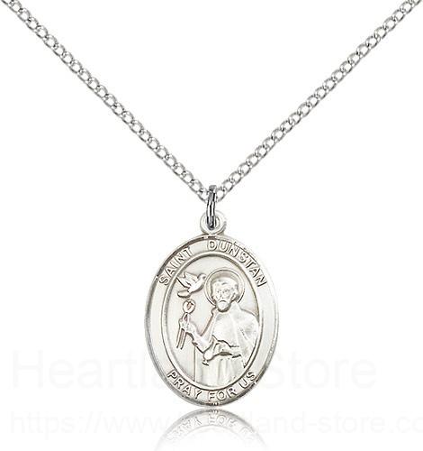 This St. Dunstan Pendant is made of sterling silver and is approximately the size of a nickel. The jewelry pendant is paired with an 18 inch sterling silver light curb chain as pictured. All medals are gift boxed in a beautiful blue velvet hinged jewelry gift box.