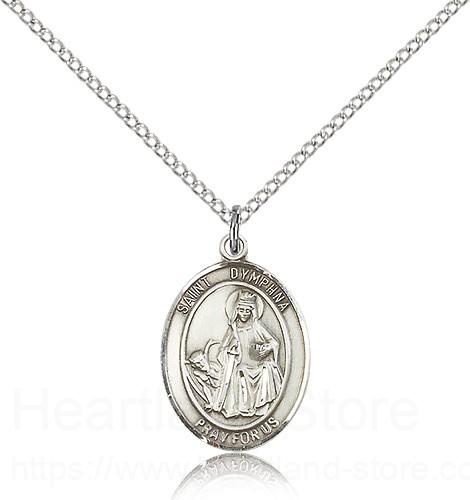 This St. Dymphna Pendant is made of sterling silver and is approximately the size of a nickel. The jewelry pendant is paired with an 18 inch sterling silver light curb chain as pictured. All medals are gift boxed in a beautiful blue velvet hinged jewelry gift box.