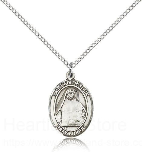 This St. Edith Stein Pendant is made of sterling silver and is approximately the size of a nickel. The jewelry pendant is paired with an 18 inch sterling silver light curb chain as pictured. All medals are gift boxed in a beautiful blue velvet hinged jewelry gift box.