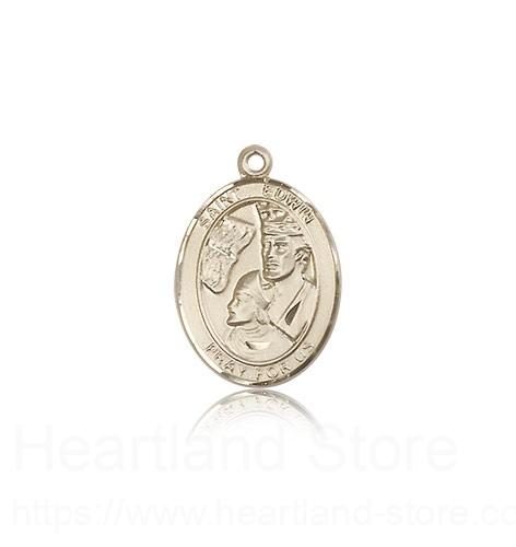 This St. Edwin Pendant is made of 14 Karat Gold and is approximately the size of a nickel. The jewelry pendant is sold individually and does not come with a chain. All medals are gift boxed in a beautiful blue velvet hinged jewelry gift box.