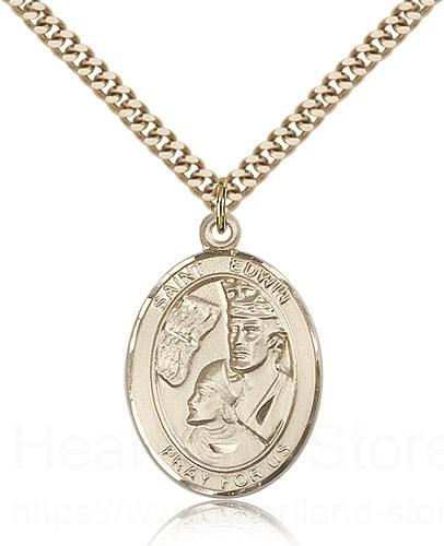This St. Edwin Pendant is made of gold filled and is approximately the size of a quarter. The jewelry pendant is paired with a 24 inch gold filled heavy curb chain as pictured. All medals are gift boxed in a beautiful blue velvet hinged jewelry gift box.
