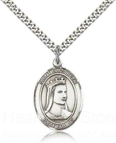 This St. Elizabeth of Hungary Pendant is made of sterling silver and is approximately the size of a quarter. The jewelry pendant is paired with a 24 inch stainless steel heavy curb chain as pictured. All medals are gift boxed in a beautiful blue velvet hinged jewelry gift box.