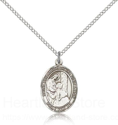 This St. Elizabeth of the Visitation Pendant is made of sterling silver and is approximately the size of a nickel. The jewelry pendant is paired with an 18 inch sterling silver light curb chain as pictured. All medals are gift boxed in a beautiful blue velvet hinged jewelry gift box.