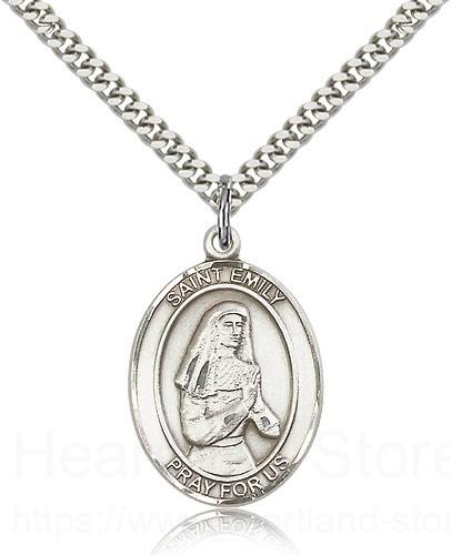 This St. Emily De Vialar Pendant is made of sterling silver and is approximately the size of a quarter. The jewelry pendant is paired with a 24 inch stainless steel heavy curb chain as pictured. All medals are gift boxed in a beautiful blue velvet hinged jewelry gift box.