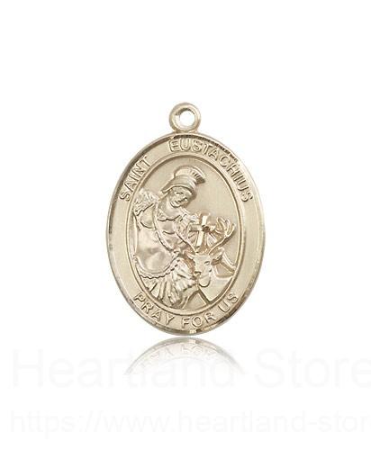 This St. Eustachius Pendant is made of 14 Karat Gold and is approximately the size of a quarter. The jewelry pendant is sold individually and does not come with a chain. All medals are gift boxed in a beautiful blue velvet hinged jewelry gift box.