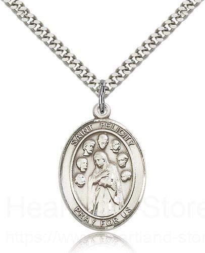This St. Felicity Pendant is made of sterling silver and is approximately the size of a quarter. The jewelry pendant is paired with a 24 inch stainless steel heavy curb chain as pictured. All medals are gift boxed in a beautiful blue velvet hinged jewelry gift box.