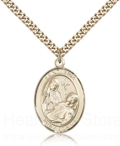 This St. Fina Pendant is made of gold filled and is approximately the size of a quarter. The jewelry pendant is paired with a 24 inch gold filled heavy curb chain as pictured. All medals are gift boxed in a beautiful blue velvet hinged jewelry gift box.