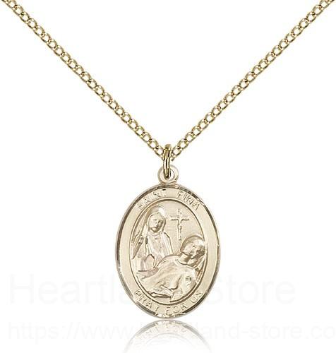 This St. Fina Pendant is made of gold filled and is approximately the size of a nickel. The jewelry pendant is paired with an 18 inch gold filled light curb chain as pictured. All medals are gift boxed in a beautiful blue velvet hinged jewelry gift box.
