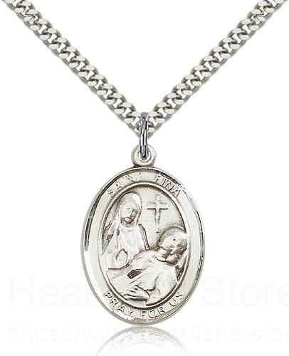 This St. Fina Pendant is made of sterling silver and is approximately the size of a quarter. The jewelry pendant is paired with a 24 inch stainless steel heavy curb chain as pictured. All medals are gift boxed in a beautiful blue velvet hinged jewelry gift box.