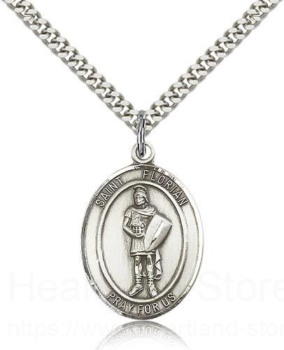 About this St. Florian Medal, Sterling Silver, Large + 24" 2.4mm Rhodium Plate Chain + Clasp