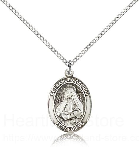 This St. Frances Cabrini Pendant is made of sterling silver and is approximately the size of a nickel. The jewelry pendant is paired with an 18 inch sterling silver light curb chain as pictured. All medals are gift boxed in a beautiful blue velvet hinged jewelry gift box.