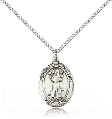This St. Francis of Assisi Pendant is made of sterling silver and is approximately the size of a nickel. The jewelry pendant is paired with an 18 inch sterling silver light curb chain as pictured. All medals are gift boxed in a beautiful blue velvet hinged jewelry gift box.