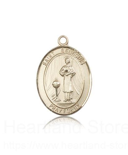 This St. Genesius of Rome Pendant is made of 14 Karat Gold and is approximately the size of a quarter. The jewelry pendant is sold individually and does not come with a chain. All medals are gift boxed in a beautiful blue velvet hinged jewelry gift box.
