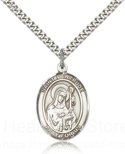 This St. Gertrude of Nivelles Pendant is made of sterling silver and is approximately the size of a quarter. The jewelry pendant is paired with a 24 inch stainless steel heavy curb chain as pictured. All medals are gift boxed in a beautiful blue velvet hinged jewelry gift box.
