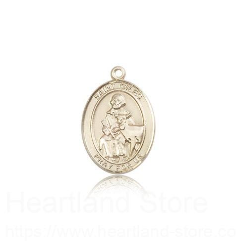 This St. Giles Pendant is made of 14 Karat Gold and is approximately the size of a nickel. The jewelry pendant is sold individually and does not come with a chain. All medals are gift boxed in a beautiful blue velvet hinged jewelry gift box.