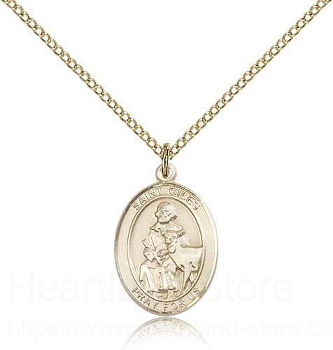 This St. Giles Pendant is made of gold filled and is approximately the size of a nickel. The jewelry pendant is paired with an 18 inch gold filled light curb chain as pictured. All medals are gift boxed in a beautiful blue velvet hinged jewelry gift box.