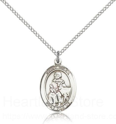 This St. Giles Pendant is made of sterling silver and is approximately the size of a nickel. The jewelry pendant is paired with an 18 inch sterling silver light curb chain as pictured. All medals are gift boxed in a beautiful blue velvet hinged jewelry gift box.
