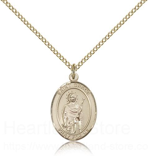 This St. Grace Pendant is made of gold filled and is approximately the size of a nickel. The jewelry pendant is paired with an 18 inch gold filled light curb chain as pictured. All medals are gift boxed in a beautiful blue velvet hinged jewelry gift box.