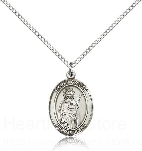 This St. Grace Pendant is made of sterling silver and is approximately the size of a nickel. The jewelry pendant is paired with an 18 inch sterling silver light curb chain as pictured. All medals are gift boxed in a beautiful blue velvet hinged jewelry gift box.