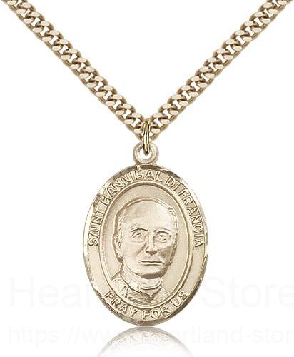 This St. Hannibal Pendant is made of gold filled and is approximately the size of a quarter. The jewelry pendant is paired with a 24 inch gold filled heavy curb chain as pictured. All medals are gift boxed in a beautiful blue velvet hinged jewelry gift box.